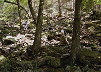 The climb up the Red Dot to the summit of Mt. Tammany on the NJ side of the Delaware Water Gap involves traversing rocks and boulders. The trail begins its sharp rise immediately via a series of timber-and-rock stairs. The steady ascent approaches an overlook high over I-80 and the Delaware River a few hundred feet below cliffs that drop nearly straight down.